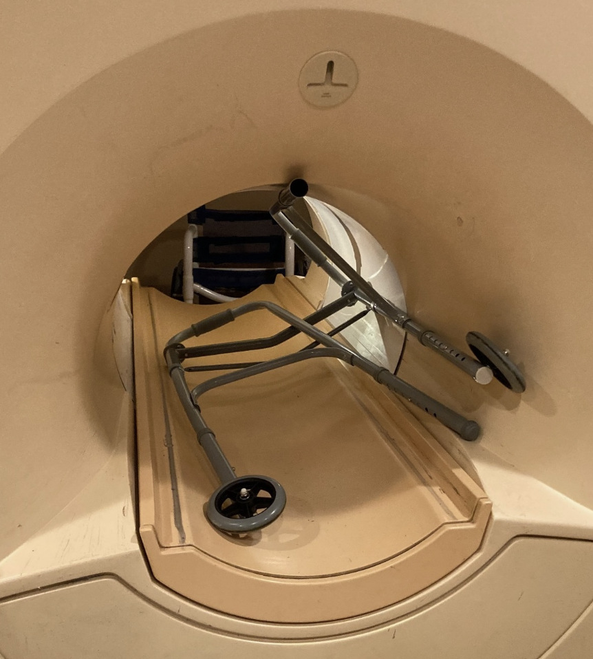 A recent safety incident at a customer site served as a stark reminder of the invisible but ever-present risks involved in servicing medical imaging equipment. In the image above, a metal walker was inadvertently brought into the magnetic field of an MRI scanner—pulled into the bore with dangerous force. Thankfully, no one was hurt. But the event could have easily ended differently.